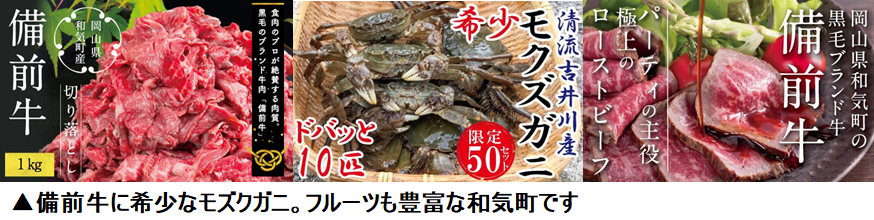 ▶▶▶さらに!ステーキや、備前牛ローストビーフも見逃せません。また、和気町を流れる清流吉井川で捕れた天然の希少なモクズガニも返礼品にご用意。市場になかなか出回らない非常に珍しい蟹です。もちろん、フルーツ王国岡山ならではのフルーツ定期便先行予約もあります。