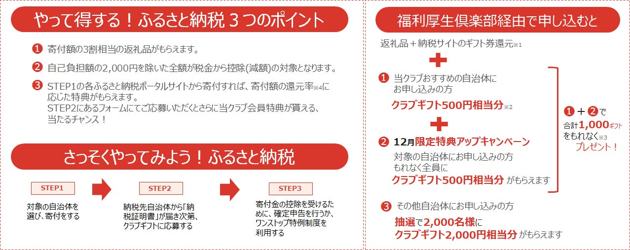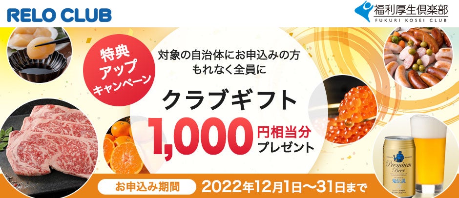 福利厚生アウトソーシングサービスのトップカンパニーである株式会社リロクラブ(東京都新宿区、代表取締役社長 岡本 盛 https://www.reloclub.jp/)が運営する福利厚生倶楽部の「ふくりのふるさと納税」では、当クラブ経由でお申し込みいただくと「返礼品+納税サイトのギフト券還元※1+クラブギフト500円相当分※2」のキャンペーンにプラスして、対象の自治体にお申し込みいただくと、もれなく全員にもらえる「特典アップキャンペーン」を12月からスタートいたしました!