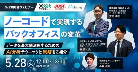 今回そうしたサービス提供をする中で培ってきた知見を活かし、株式会社ジャストシステム様とともに、Aismiley主催のウェビナーに登壇し、「ノーコードで実現するバックオフィスの変革」をテーマに、データを最大限活用するためのAI分析テクニックと戦略をご紹介させていただきます。これからAI技術を社内に導入したい方や、AI技術を活用したPOCサービスなど注目のウェビナーとなっておりますので、ぜひご参加ください。