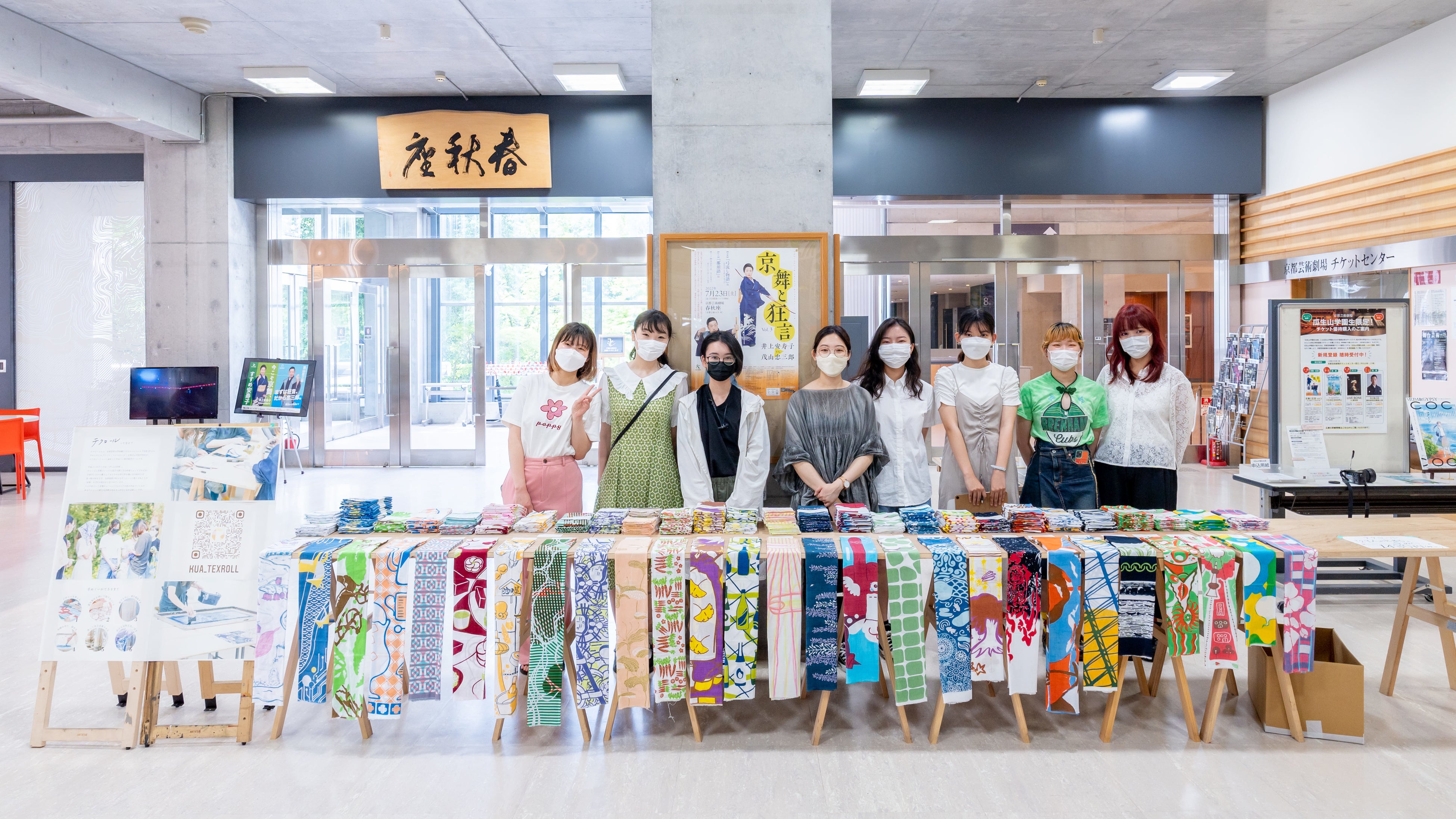 今年度は本学の専任講師で、山元染工場四代目の妻である山元桂子氏が主催する「ケイコロール」とコラボし、山元桂子氏の指導のもと、美術工芸学科 染織テキスタイルコースの学生29名が手ぬぐいブランド「テクロール」を立ち上げ、「29人の京都」をテーマに手ぬぐいを制作しました。デザインや染色はもちろん、オンラインショップの立ち上げや運営、パッケージング、SNS発信を学生自ら手掛けています。