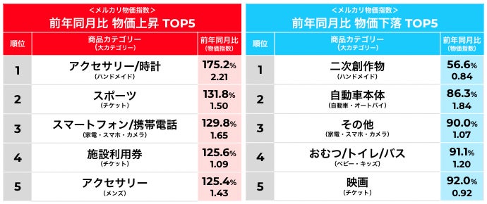 - 「メルカリ物価・数量指数」は、月間利用者数2,000万人超のフリマアプリ「メルカリ」を活用し、「メルカリ」内の取引価格と流通数量の変動状況を、「メルカリ」における商品カテゴリー毎に月単位で表す価格指数・数量指数です。個人間商取引における消費者の需要を可視化していく世界初※1の取り組みです。各種データを参照した消費トレンドを発信している報道関係者をはじめ、物価変動を取り扱うマクロ経済学、消費者行動、マーケティング等の研究者に情報を開示し、経済・研究活動に寄与することを目的としています。本ニュースレターでは、「メルカリ」の“中カテゴリー”に限定し、前年同月比で物価及び数量指数が上昇、または下落した商品カテゴリーを紹介しています。※1:メルカリ及びUTEcon調べ