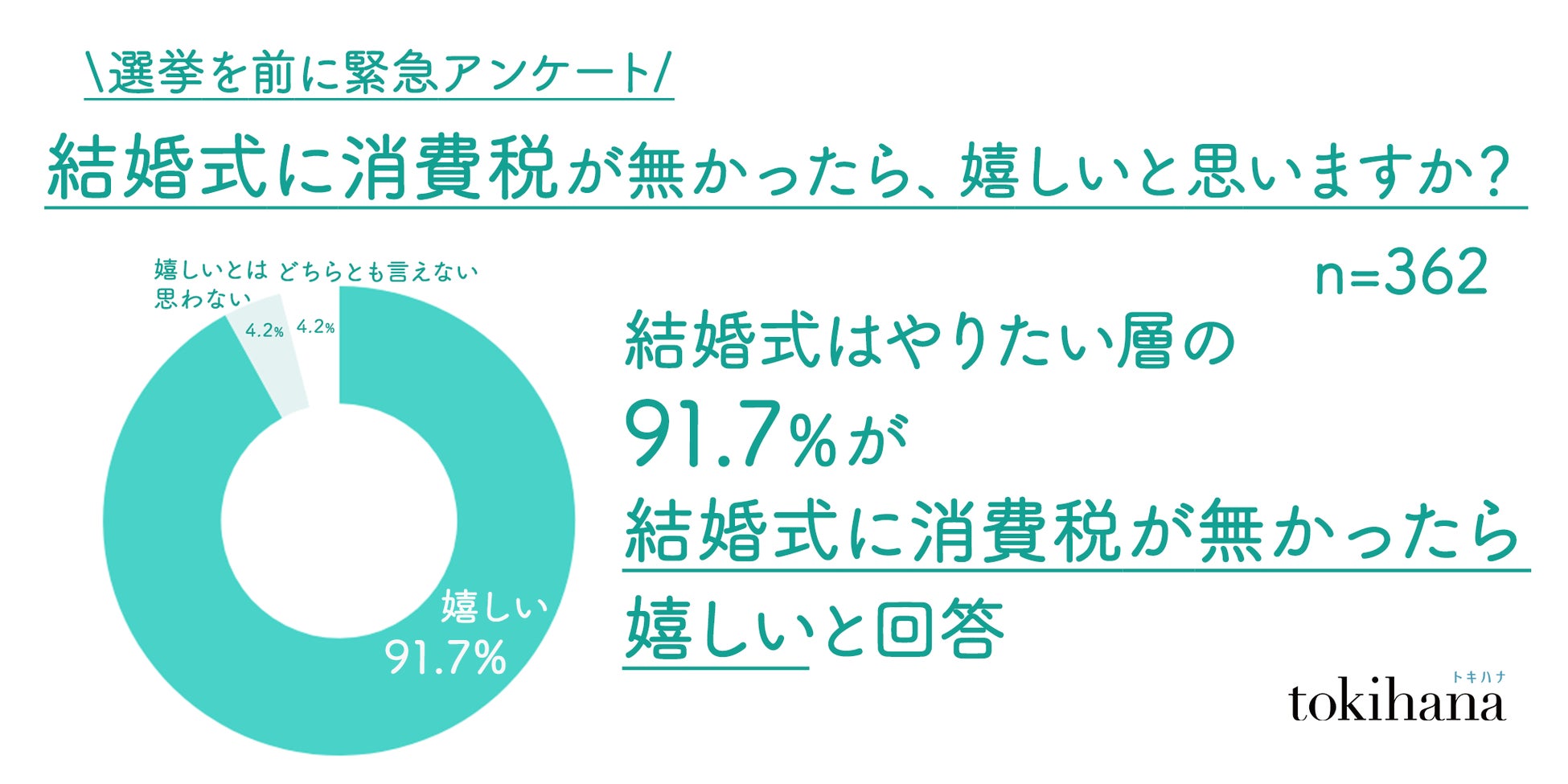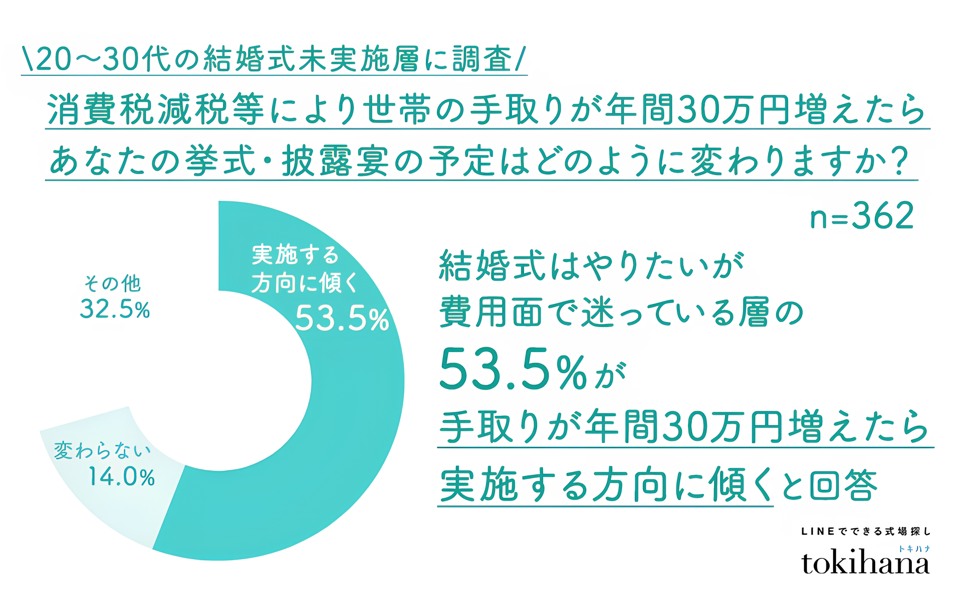 LINEでできる式場探しサービス『トキハナ(https://tokihana.net/)』を運営する株式会社トキハナ(本社:東京都港区、代表取締役社長:安藤 正樹)は、結婚式を実施していない既婚の20〜30代男女362名を対象に、「消費税が結婚式に与える影響」について調査を実施しました。