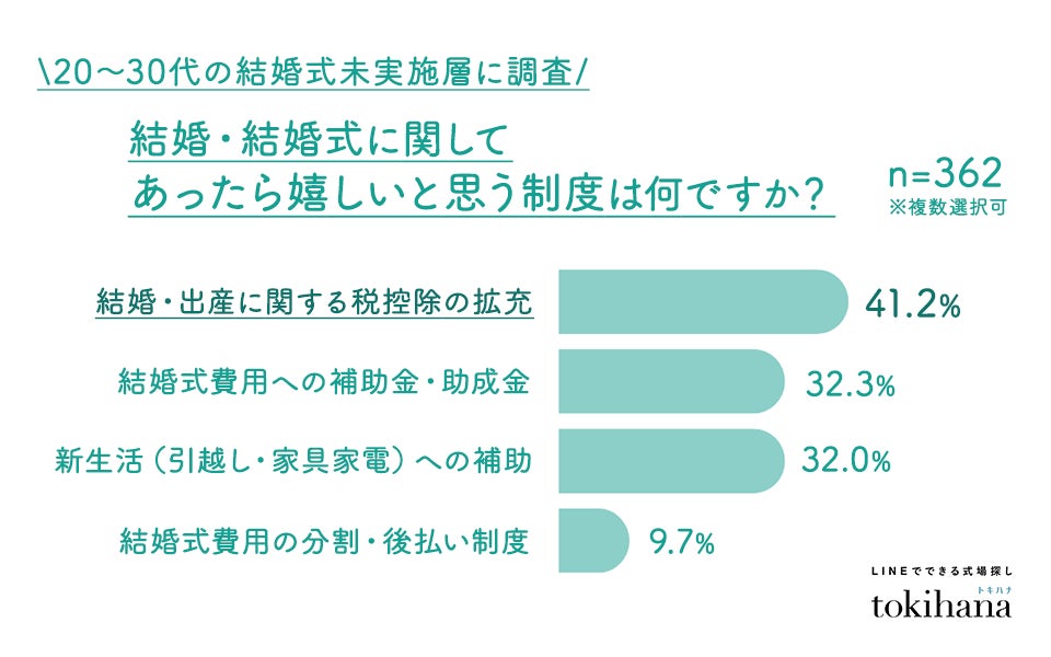 最後に、「結婚・結婚式に関して、あったら嬉しい制度」について尋ねたところ、最も回答が多かったのは「結婚・出産に関する税控除の拡充(41.2%)」次いで「結婚式費用への補助金・助成金(32.3%)」という結果になりました。