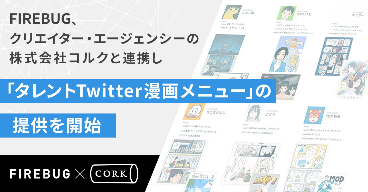 FIREBUG、クリエイター・エージェンシーの株式会社コルクと連携し「タレントTwitter漫画メニュー」の提供を開始