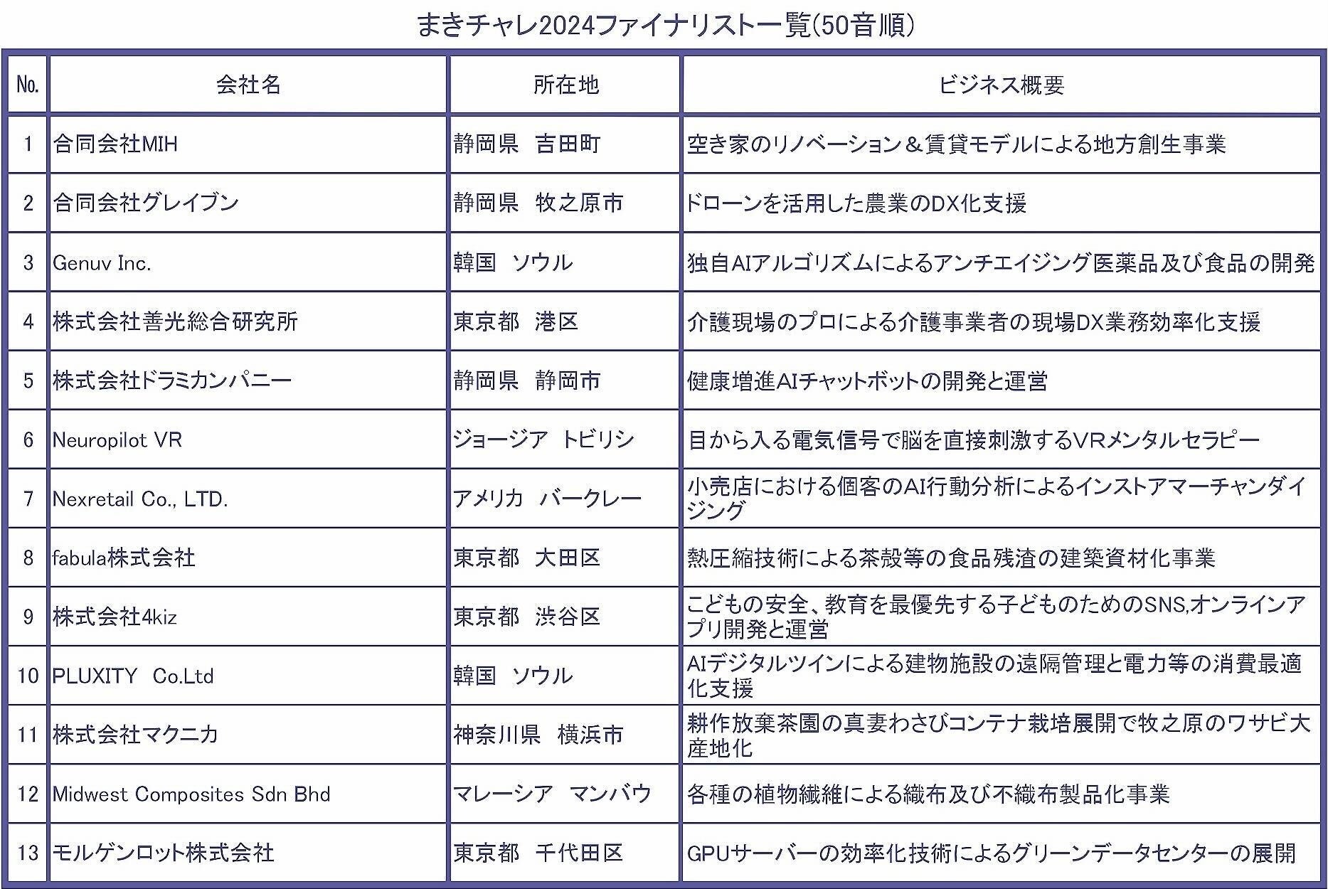 牧之原市主催の「牧之原チャレンジビジネスコンペティション2024」(以下「まきチャレ2024」といいます。)の表彰式を11月12日、牧之原市相良総合センター”い~ら”で開催し、ファイナリスト13社の中から、各賞を発表いたしましたので、お知らせします。