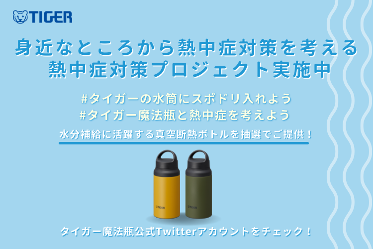 タイガー魔法瓶公式Twitterアカウント(@Tiger_PR_JPN)にて、熱中症リスクがより高い日の呼びかけとして行ってきた「#タイガーの水筒にスポドリいれよう」キャンペーンを9月も延長して実施することが決定いたしました。冷たさをキープする真空断熱ボトルでこまめに水分補給をしていただくことで、熱中症対策にぜひご活用ください。
