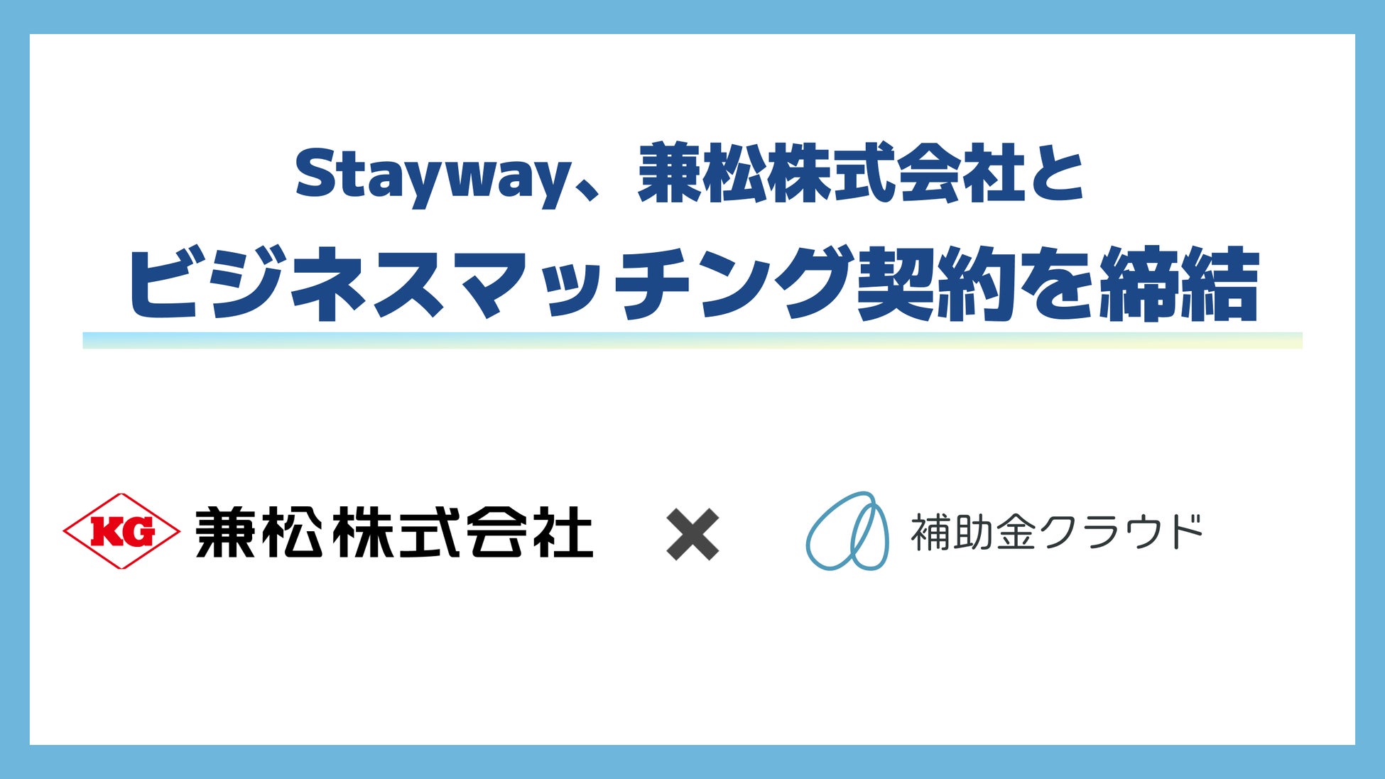 補助金支援のDXを通じた経営支援サービス「補助金クラウド」「前ほじょくん(補助金債権の早期資金化)」を運営する株式会社Stayway(本社:大阪府大阪市、代表取締役: 佐藤 淳、以下「Stayway」)は、兼松株式会社(本社:東京都千代田区、代表取締役社長:宮部 佳也、以下「兼松」)とビジネスマッチング契約を締結いたしましたことをお知らせいたします。