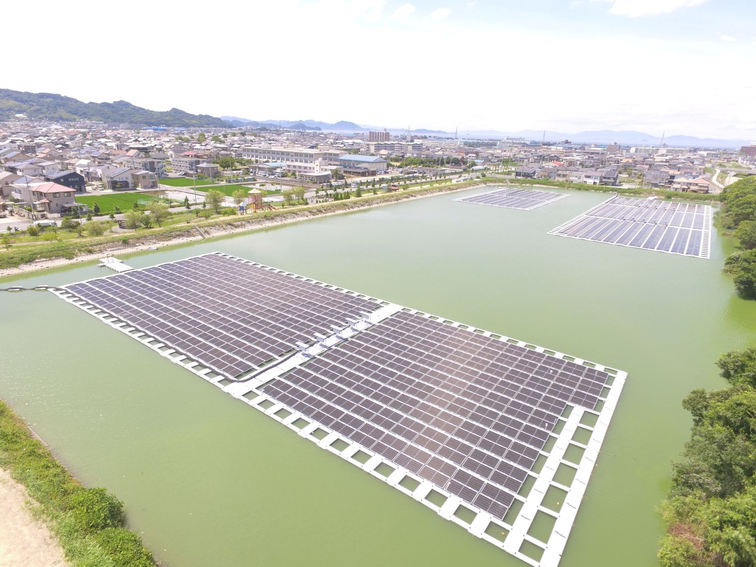 太陽グリーンエナジーが愛媛県に2カ所、新たな水上太陽光発電所を開所