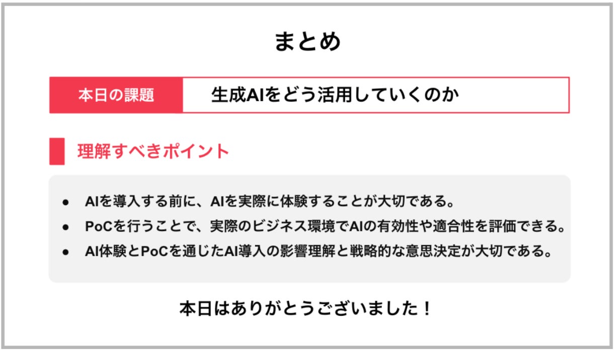 生成AI戦国時代に参入していますが、まずはAIを実際に体験し、AIができることを知ることが大切です。AIに触れることで、伝聞されただけではない経験をすることができ、新しいAIの可能性について考えることができます。