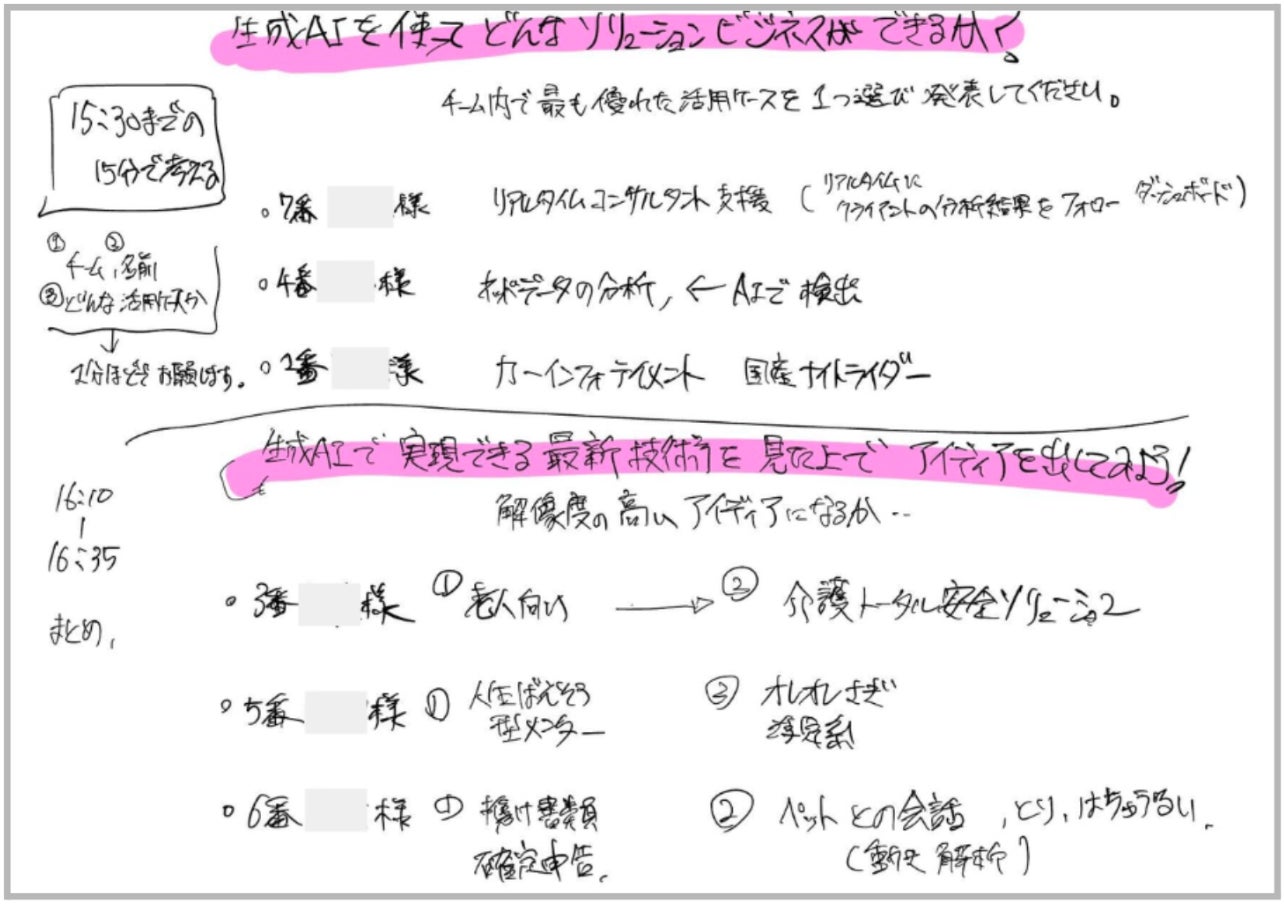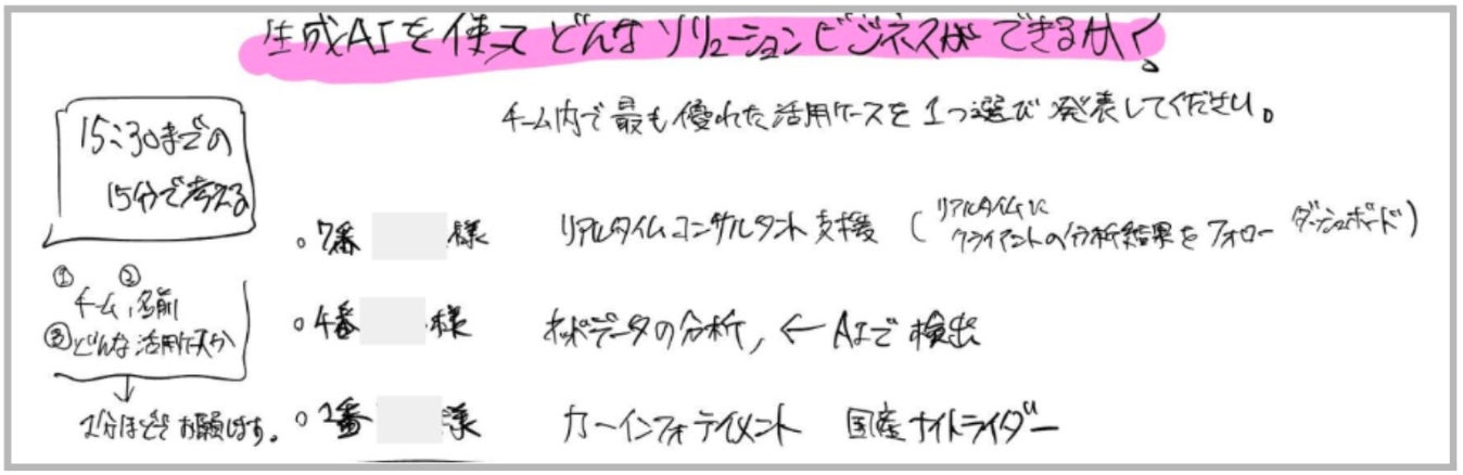 そこで今回は、生成AI技術をビジネスにどう活かすかについてのワークを行いました。