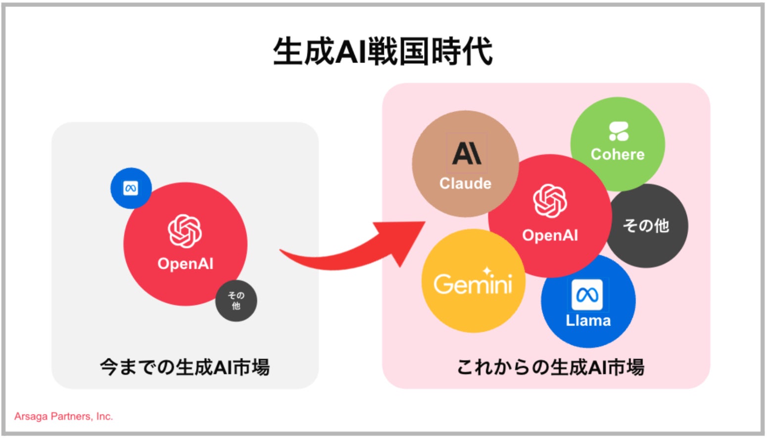 2022年秋のOpenAI社のChatGPTリリース以降、生成AI市場は「生成AI戦国時代」と呼ばれる激しい競争に突入しました。Google社のGeminiやAnthropic社のClaudeをはじめとし、それぞれが独自の強みを活かして生成AI市場に参入しています。