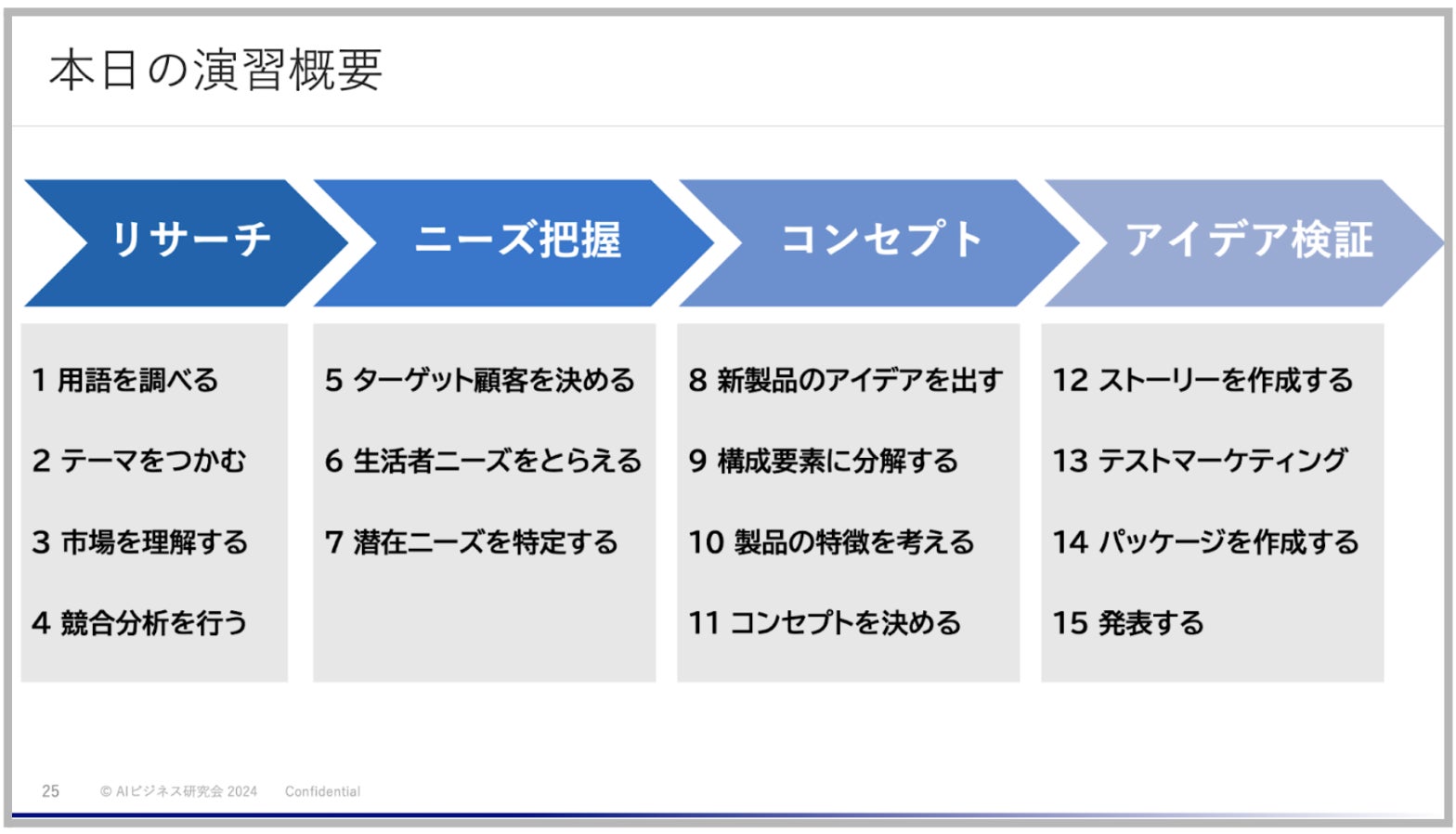参加者は、まずChatGPTを使ってリサーチ・ニーズの把握を行います。市場の分析や競合、消費者についての調査を行った後、具体的な商品のコンセプトやペルソナを決めていき、最後は消費者の購買意欲を掻き立てるような商品を企画してもらいます。画像生成AIを活用し、商品のパッケージを作成するまでがワークです。