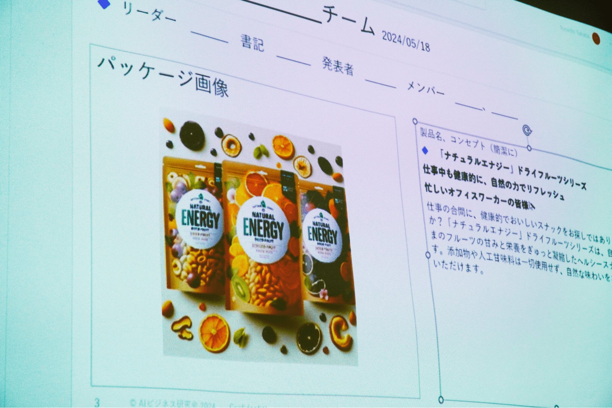 20分ほどの短いワークではありましたが、発表者したグループ全てがパッケージ画像の作成まで完了することができました。生成AIを活用したことで、市場調査やペルソナの設定がスムーズに進み、それぞれが持ち合わせた社会課題に対する意識と知識を合わせることで、製品のコンセプトもしっかりした、そのまま商品化できそうな企画案が作成されました。