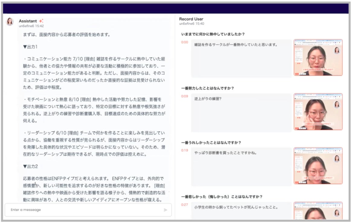 話した内容だけでなく、画面に映った表情や声色、話し方など、多様な情報を分析し、その人の強みや適している職業を提案しました。