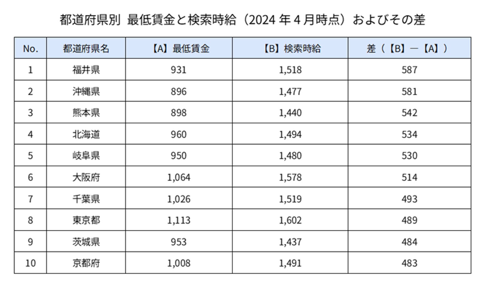 2024年4月時点の最低賃金の全国平均は1,004円で、検索時給の1,507円との差は503円にのぼる。また、都道府県別に最低賃金と検索時給(2024年4月時点)の差をみると、差が大きい順に福井県(587円)沖縄県(581円)、熊本県(542円)、北海道(534円)、岐阜県(530円)となっている。半導体工場の建設などの新たな産業が発展している地域(熊本県、北海道)や、各県の最低賃金に対して物価(消費者物価地域差指数)が相対的に高い地域(沖縄県、福井県)において、最低賃金と検索賃金の差が大きい傾向がある。