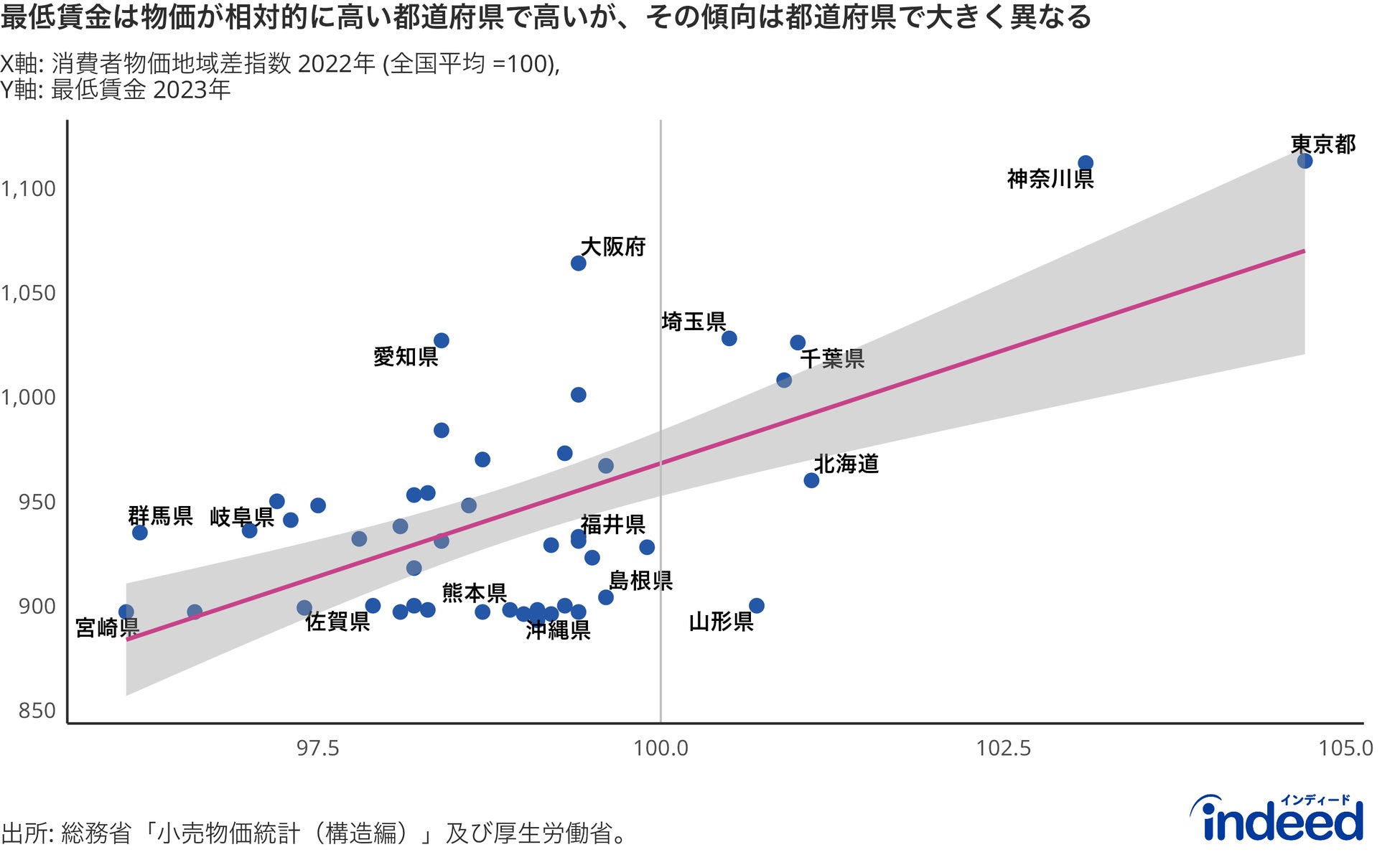 消費者物価地域差指数(X軸)と最低賃金(Y軸)を都道府県別にプロットしたもの。消費者物価地域差指数とは、世帯が購入する財及びサービスの価格を総合した物価水準の地域間の差について全国平均価格を基準(=100)とした指数値を表す。すなわち、100以上であれば相対的に物価が高い都道府県であることを意味する。消費者物価地域差指数については、総務省「小売物価統計調査(構造編)」より現時点で最新であった2022年データを活用。