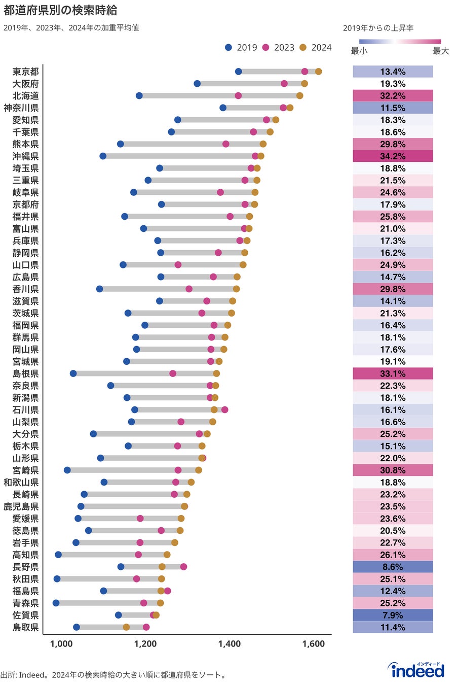 勤務地として検索されている都道府県別に、2019年(1〜12月)、2023年(1〜12月)、2024年(1〜4月)の検索時給と、2019年と2024年を比較した上昇率を調べました。
