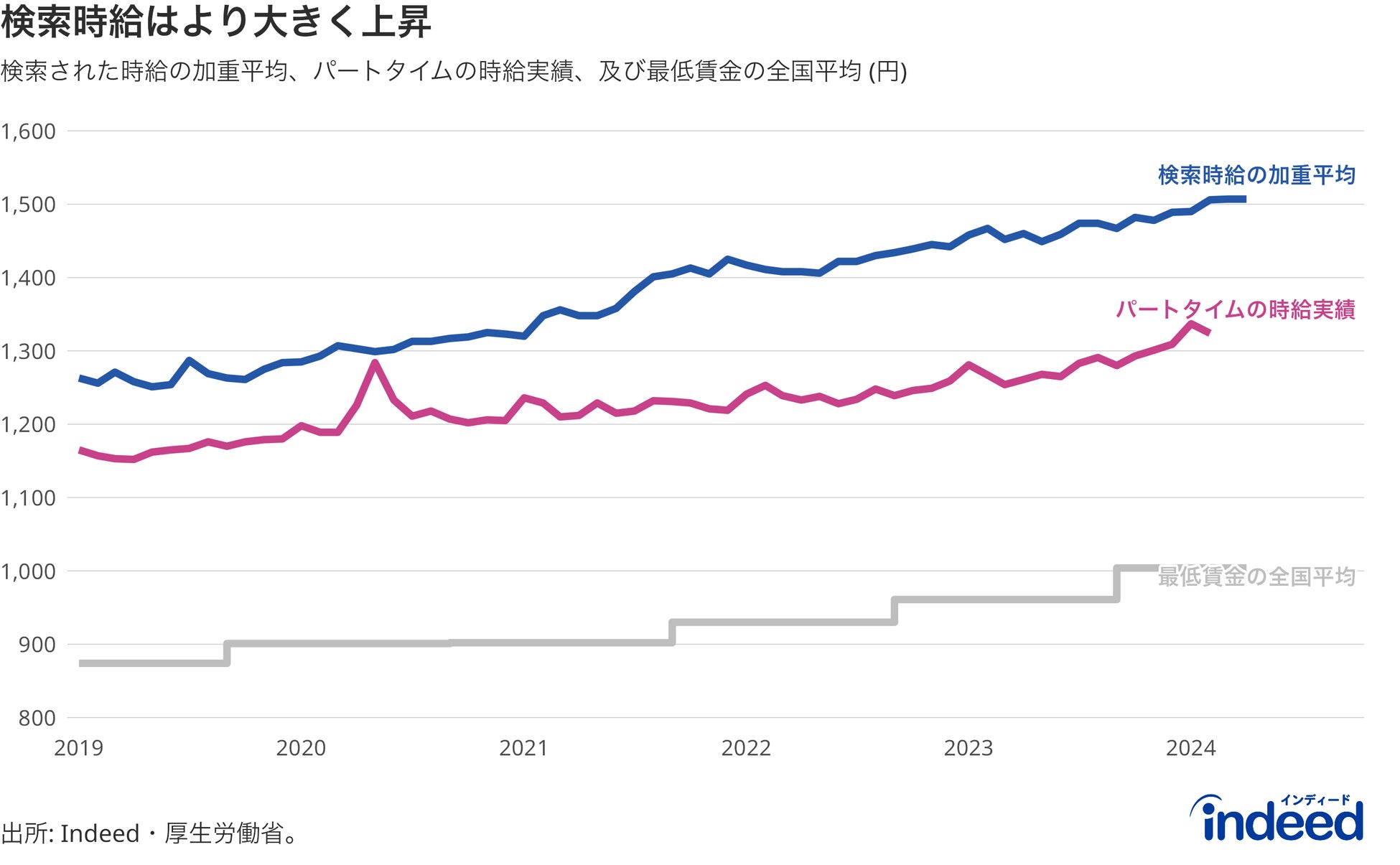 Indeedにおける検索時給の加重平均値、パートタイム労働者の時給実績(厚生労働省「毎月勤労統計調査」より)、最低賃金の全国平均(厚生労働省)の推移。期間は2019年1月から2024年4月まで。ただしパートタイム労働者の時給実績については最新月である2024年3月まで。