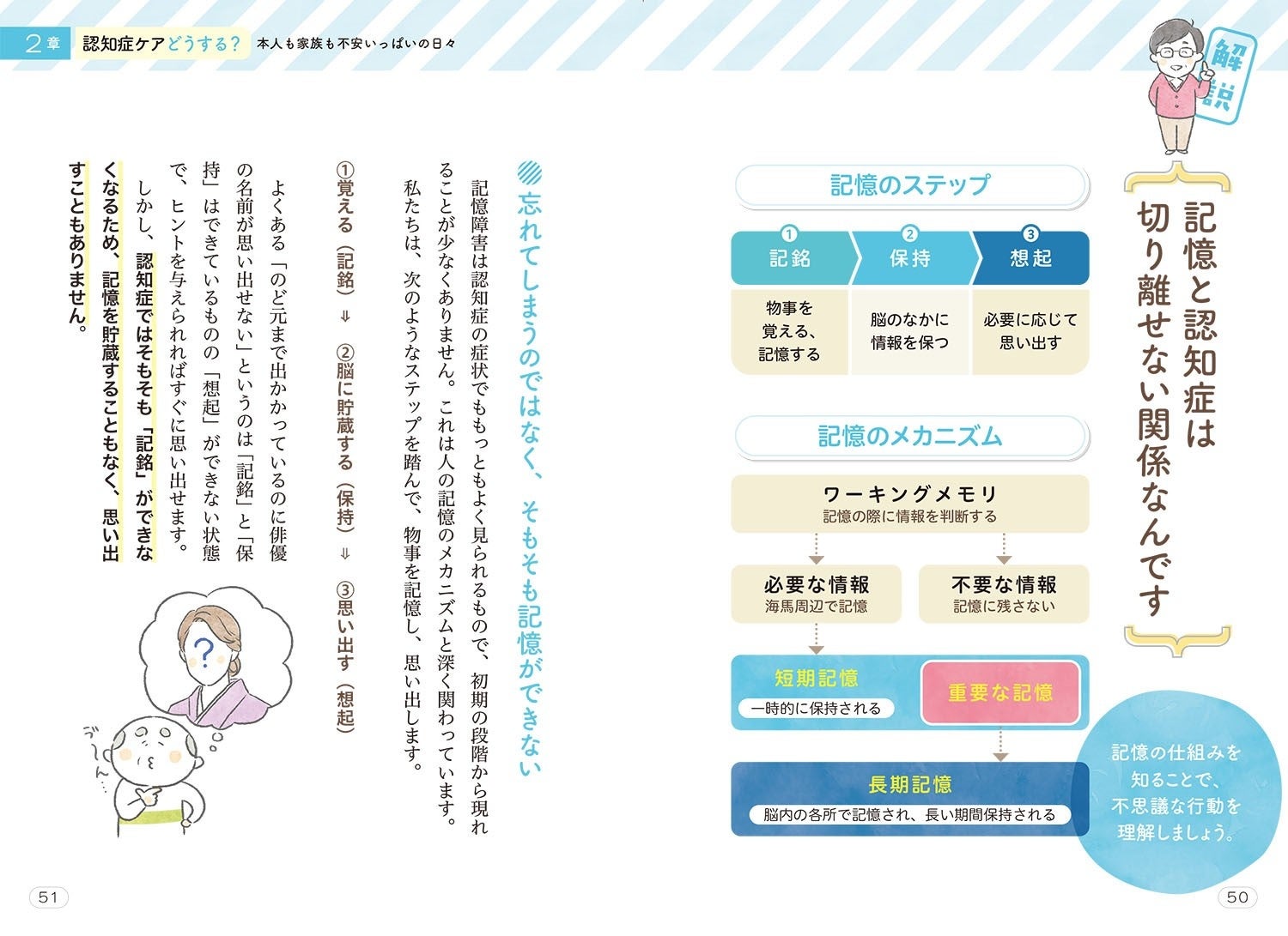 また、本のためし読みサイトネットギャリーには、現役介護士の方から「よくあるケースがまとまっていますし、最初のもしかして?の段階から、症状が進んでくるとこんなケースが…、ということが、時系列のように書かれているので読み進めやすいです。色合いやフォント、イラストがソフトな印象で堅苦しくなく、漫画も入っていてイメージしやすいと思いました。 」といった感想も寄せられています。