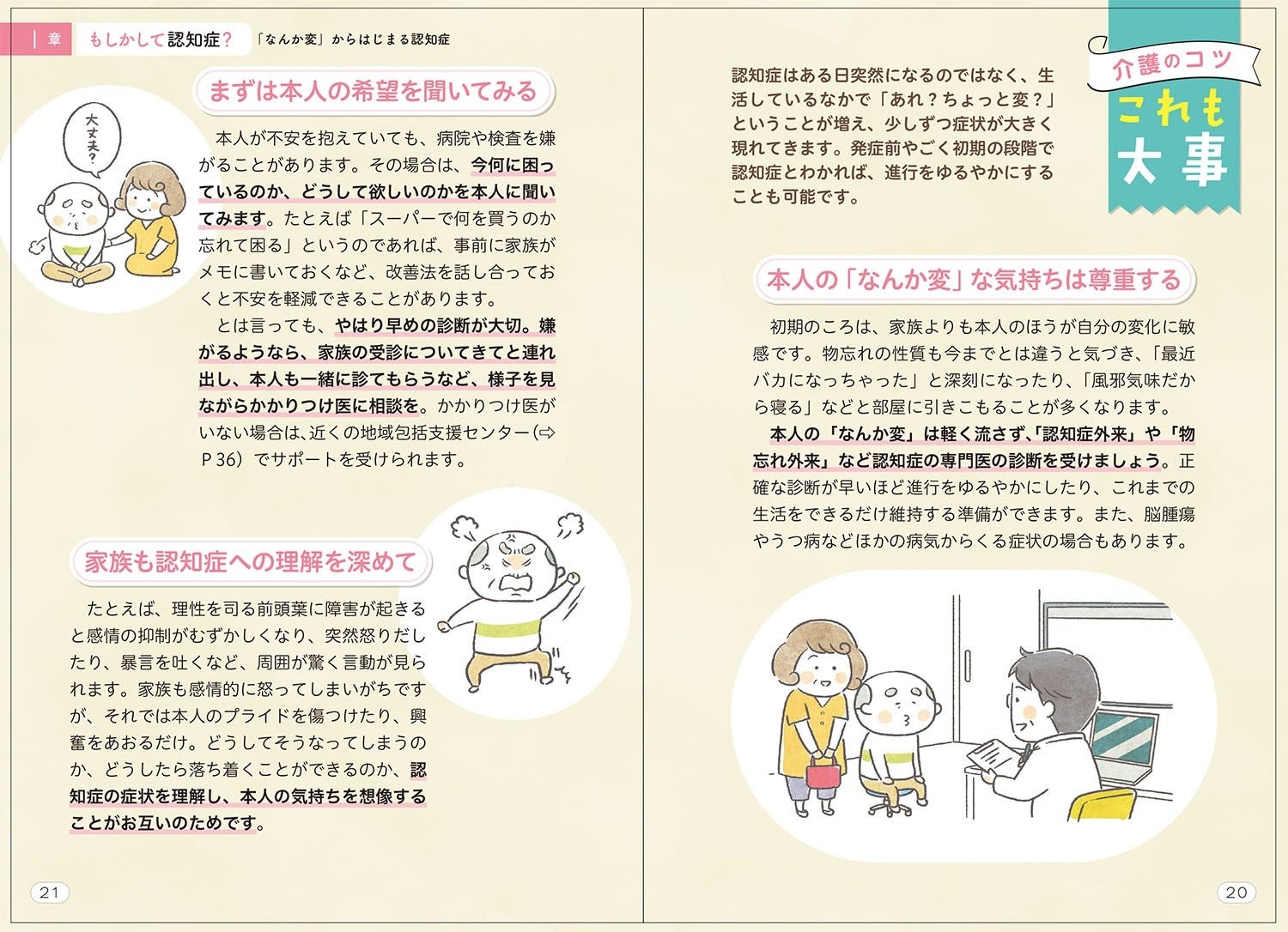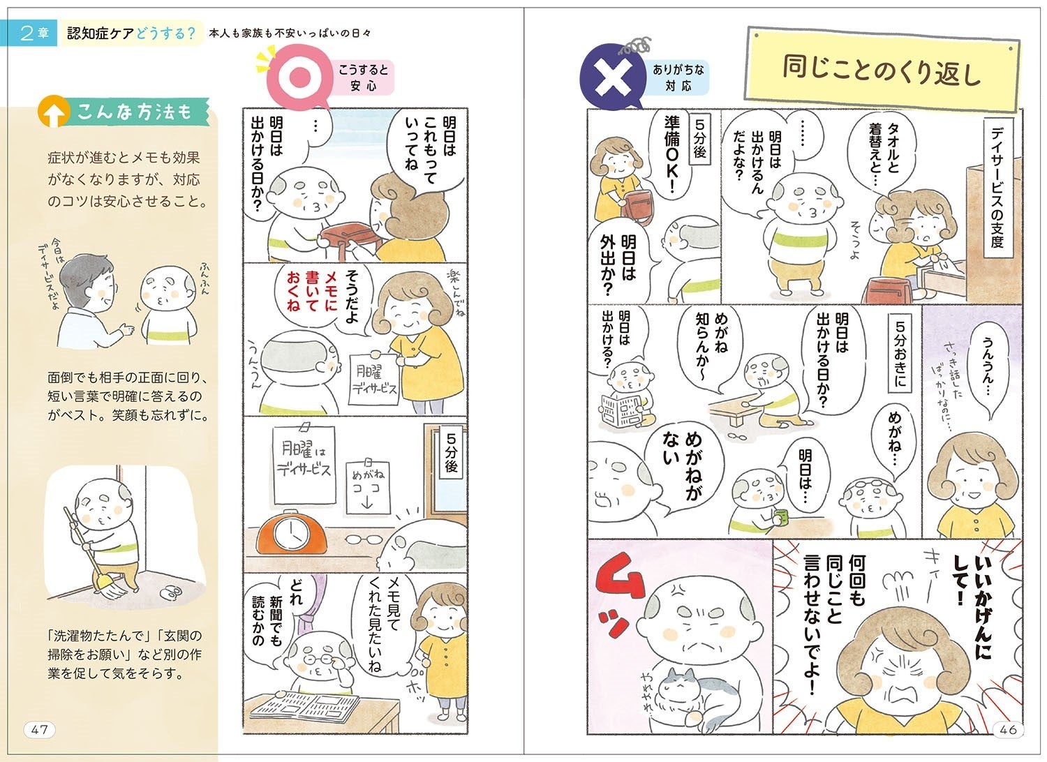 本書では認知症と診断されたおじいちゃんとその家族を描いたマンガをベースに、認知症の方の行動の「なぜ?」を丁寧に解説。家族がついやってしまいがちなNG対応と、正しい対処法について紹介しています。