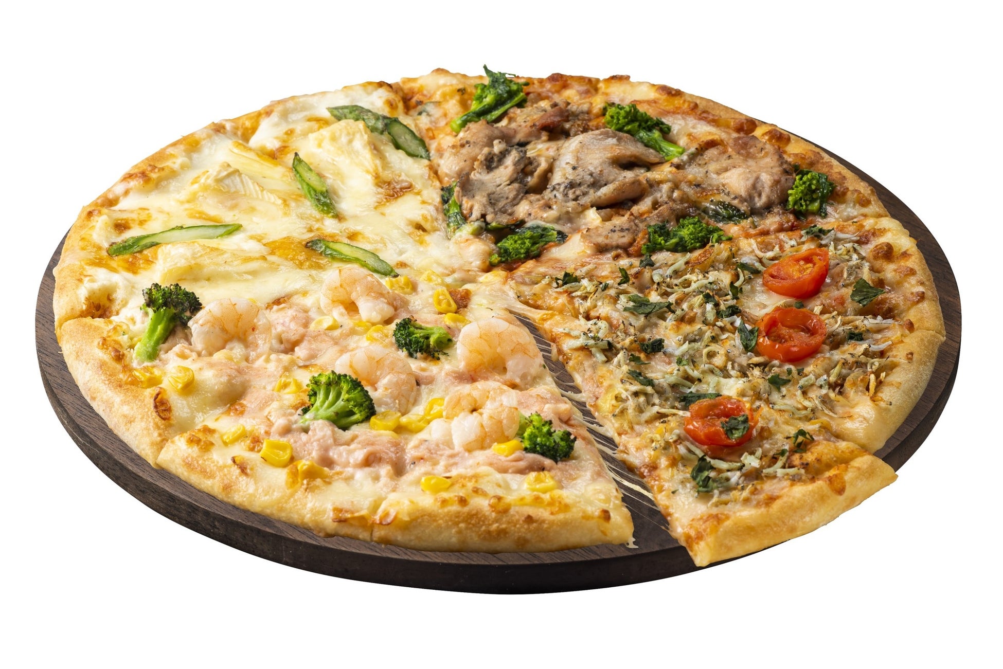 ③ぷりぷりシュリンプ&駿河湾産桜エビソース ④北海道産3種のチーズ&濃厚クリームソースの4種類を1枚で楽しめます。
