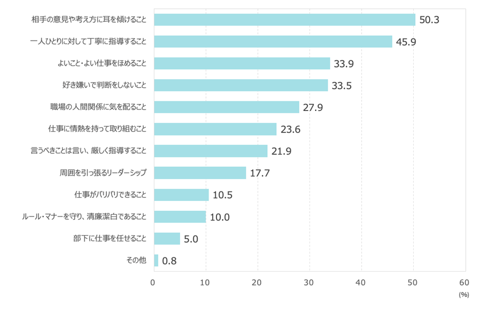 ●上司に期待することトップ2は、トップ2は「相手の意見や考え方に耳を傾けること」 (50.3%)、「一人ひとりに対して丁寧に指導すること」(45.9%)。最下位は「部下に仕事を任せること」(5.0%)