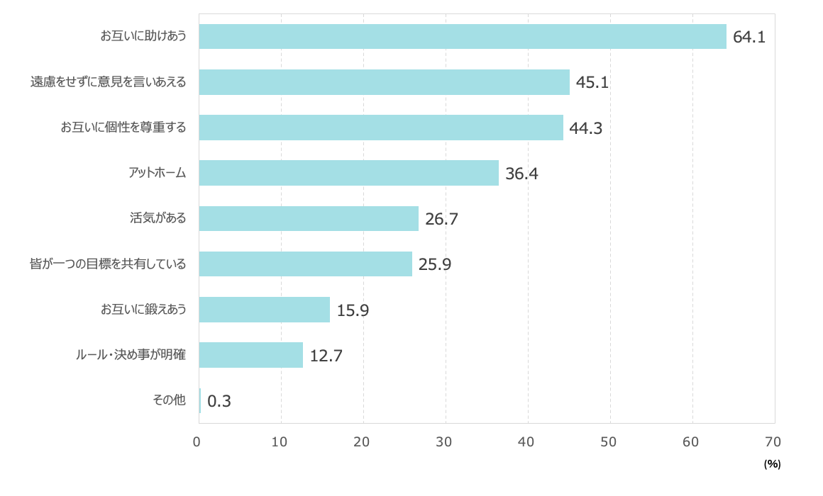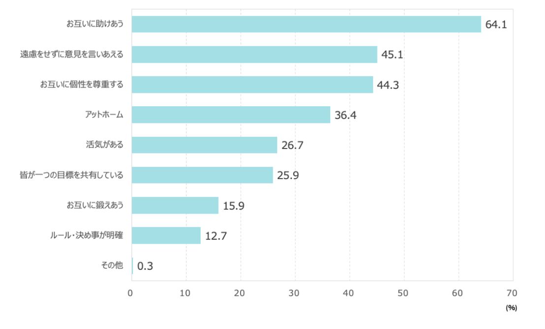 ・働きたい職場の特徴は、「お互いに助けあう」がトップ(64.1%)。