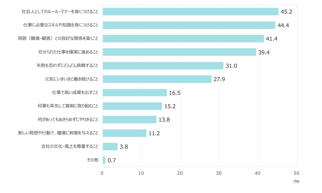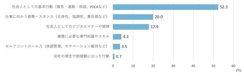 ●新入社員時代に身につけるべきことは、「社会人としての基本行動」(52.3%)がトップ、「会社の理念や価値観に沿った行動」(0.7%)が最下位