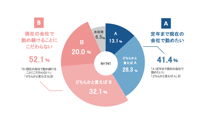 ●就職先での勤続意向は「現在の会社で勤め続けることにこだわらない・どちらかと言えばこだわらない」(52.1%)が「定年まで現在の会社で勤めたい・どちらかと言えば勤めたい」(41.4%)を上回る