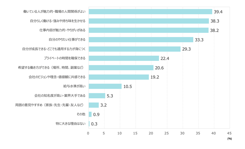 ●就職先の会社を選ぶうえで重視していたものトップ3は、「働いている人が魅力的・職場の人間関係がよい」(39.4%)、「自分らしく働ける・強みや持ち味を生かせる」(38.3%)、「仕事内容が魅力的・やりがいがある」(38.2%)。最下位は「周囲の意見やすすめ」(3.2%)