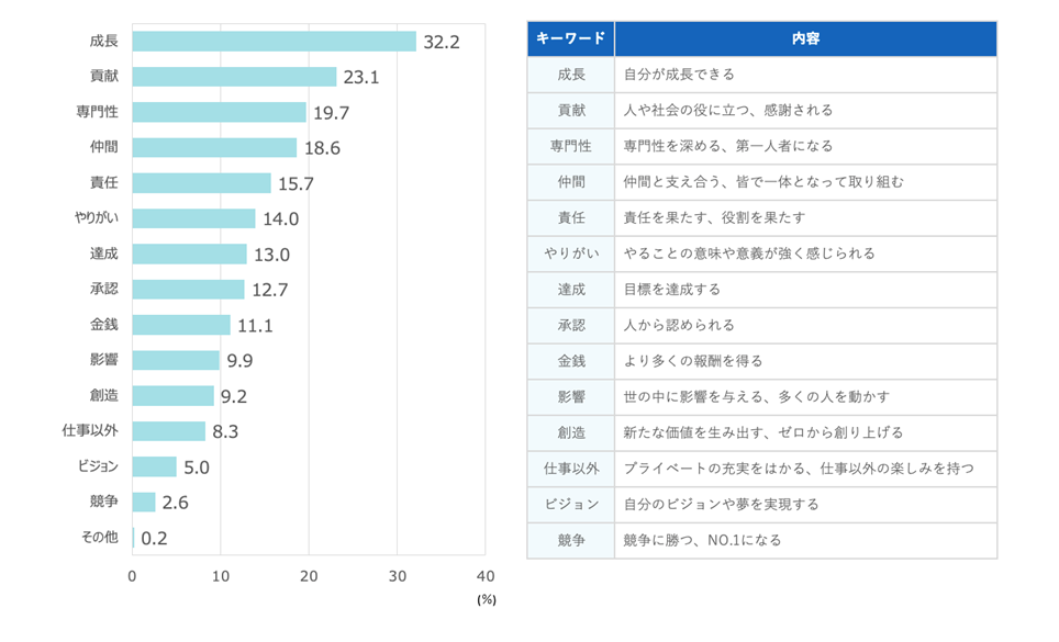 ・仕事をするうえで重視したいことは、「成長」(32.2%)と「貢献」(23.1%)がトップ2。