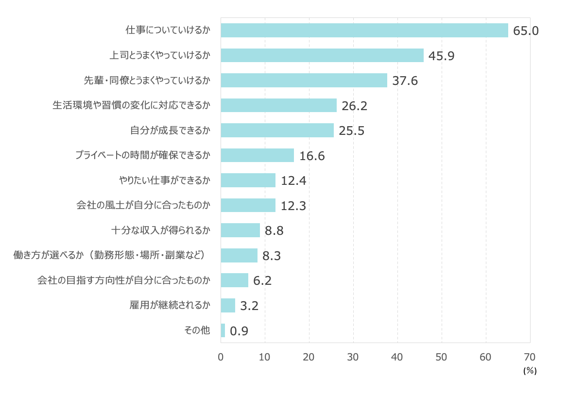 ●仕事・職場生活をするうえでの不安のトップ2は、「仕事についていけるか」(65.0%)「上司とうまくやっていけるか」(45.9%)。最下位は「雇用が継続されるか」(3.2%)