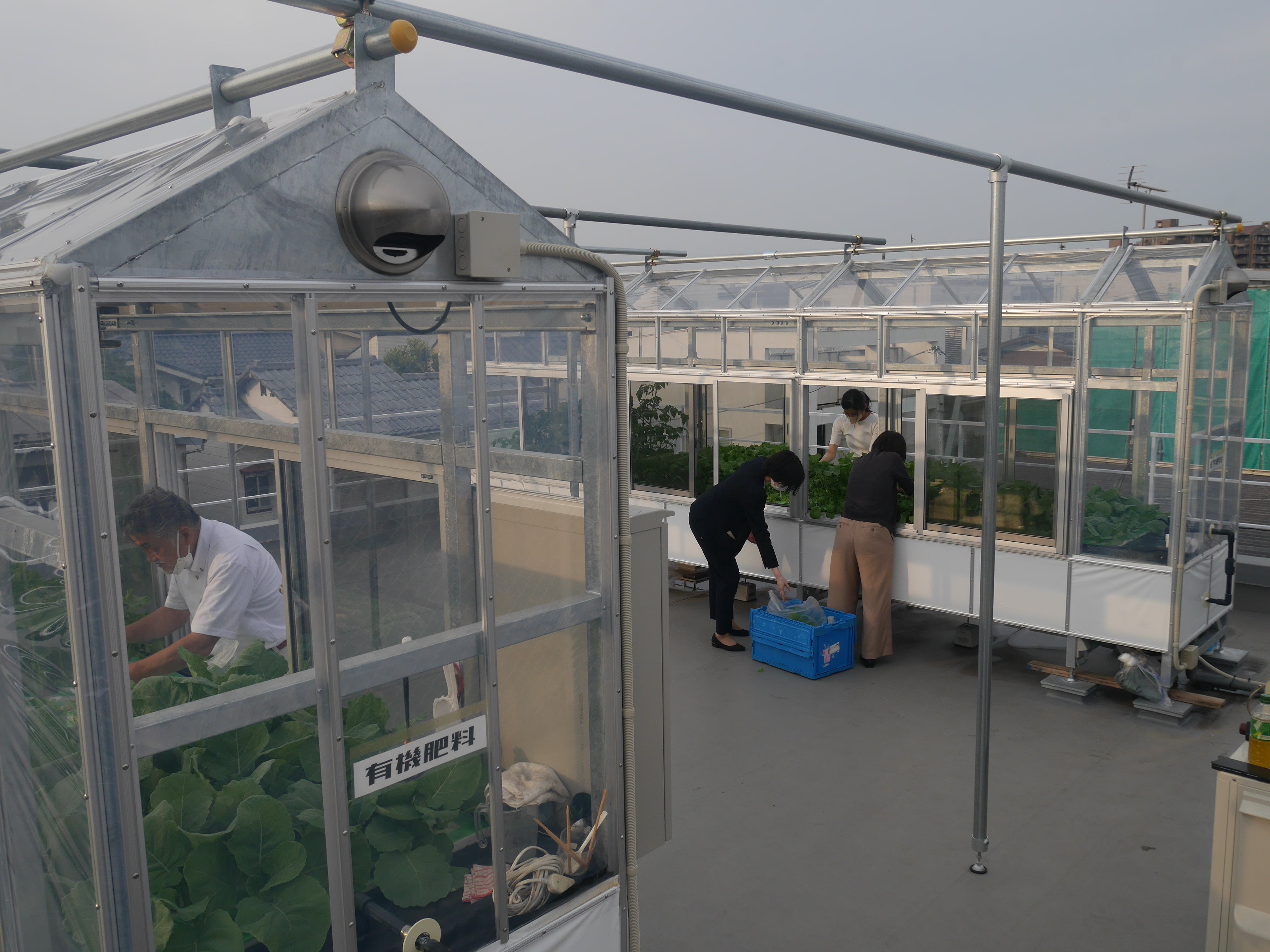 学生寮の屋上で無農薬・有機肥料の水耕栽培を実施