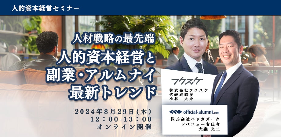株式会社ハッカズーク(本社:東京都文京区、代表取締役CEO:鈴木仁志)は、8/29(木)12時より、無料オンラインセミナー『人材戦略の最先端 人的資本経営と副業・アルムナイ最新トレンド』を株式会社フクスケ(所在地:東京都千代田区、代表取締役:小林 大介)との共催にて実施いたします。【お申込みはこちら :https://official-alumni.com/seminar/20240829#form】