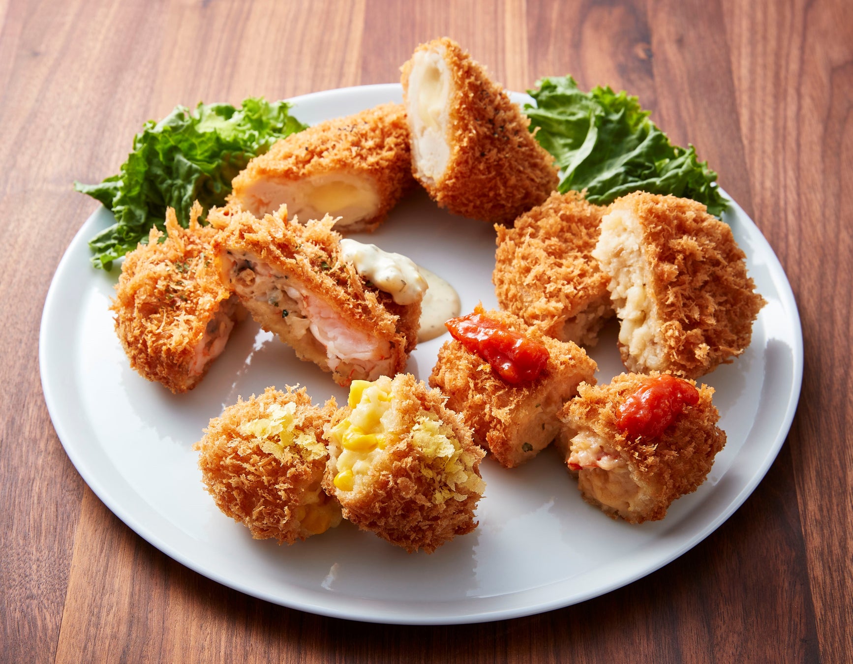 (内容:シンプルなじゃがいもコロッケ、北海道産とうもろこしのクリームコロッケ、紅ずわい蟹のクリームコロッケ、海老と帆立のカツ、とろーりチーズのチキンカツ 各1個)