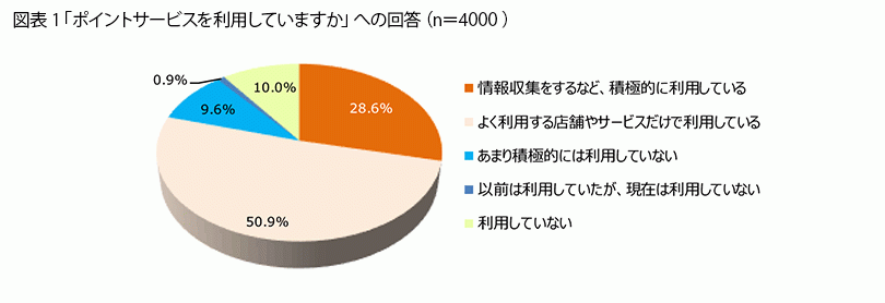 まず、ポイントサービスの利用状況について、さまざまな側面からたずねてみました。図表1は、そもそもポイントサービスをどの程度力を入れて利用しているかを聞いた結果です。「情報収集をするなど、積極的に利用」28.6%に対し、「よく利用する店舗やサービスだけで利用」は50.9%と倍近くにのぼり、自然体でサービスを利用している人が半数に。「あまり積極的には利用していない」は9.6%、また「以前は利用していた」を含め「利用していない」は10.9%と、消極利用派より非利用派が多い結果となりました。