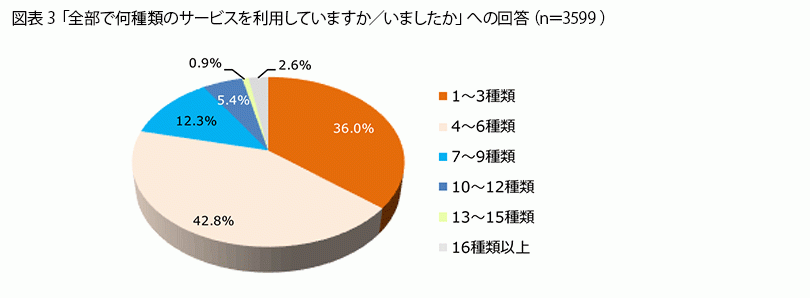 次は過去を含め利用経験がある人に、使っている/使っていたサービスの数をたずねてみました(図表3)。42.8%と最も多かったのが「4~6種類」、これに「1~3種類」が36.0%と6.8ポイント差で続きました。対して「7~9種類」12.3%、「10~12種類」5.4%、「13種類以上」計3.5%と、7種類以上は全体の2割強にとどまる結果に。“何でも”というより、“厳選・集約して、効率よく”ポイントを集めている人が多いようです。