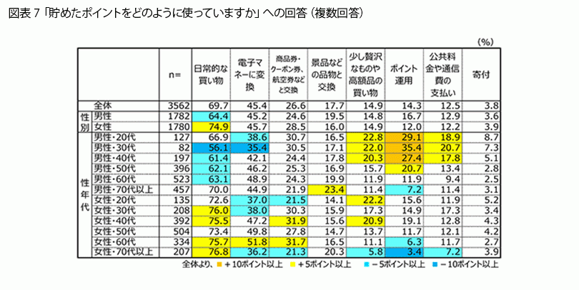 貯まったポイントをどのように使うかでは(図表7)、「日常的な買い物」69.7%、「電子マネーに変換」45.4%、「商品券・クーポン券、航空券などと交換」26.6%がベスト3と、堅実な用途が上位に並び、「少し贅沢なものや高額品の買い物」の“ご褒美使い”は14.9%にとどまりました。性年代別では、「日常的な買い物」「電子マネーに変換」「商品券などに交換」は子育て世代を中心とした女性で高い傾向がみられました。若年層では「少し贅沢なもの」や「公共料金・通信費の支払い」の比率が高い傾向にあり、特に「ポイント運用」は20~40代男性で突出して高いというのは興味深いところです。
