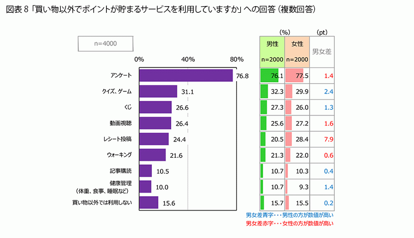 ここまで買い物やサービス利用で獲得できるポイントサービスについてみてきましたが、アプリやサイト経由でクイズやくじに参加したり、アンケートに回答したりすることでもポイントを獲得できるケースもあります。こうした買い物以外のサービスの活用状況についても聞いてみました(図表8)。