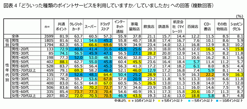 性年代別では、「共通ポイント」は男女とも中高年で高値傾向を示し、特に男性30代以下を中心とする若年層が低位なのは少し意外ですね。「クレジットカード」は年齢層が高い傾向がより鮮明です。日用品の買い物で利用する「スーパー」「ドラッグストア」では女性が男性を各12ポイント・24.4ポイント上回っており、特に「ドラッグストア」では女性の全年代で高値を示しました。男性が女性を上回るのは「家電量販店」のほか、交通系の「鉄道系」「航空会社」に。若年層では「飲食店」「CD・書店」「ショッピングビル」が全体より高い傾向を示しました。