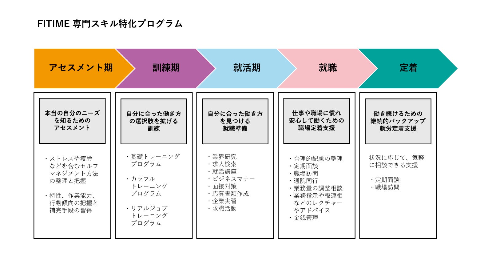 これまで、るりはりの利用者の中にはサービス業で人と接する仕事を希望する方も多かったこともあり、サービス業に特化した就労移行支援「FITIME」として生まれ変わることとなりました。多様な職業体験やリアルジョブトレーニングを提供することで、利用するすべての人が「利用してよかった」と感じられるサービスを創造します。そして、FITIMEで訓練を経た障害者がサービス業で活躍することで、日本の労働市場における人手不足の課題解決にも貢献します。