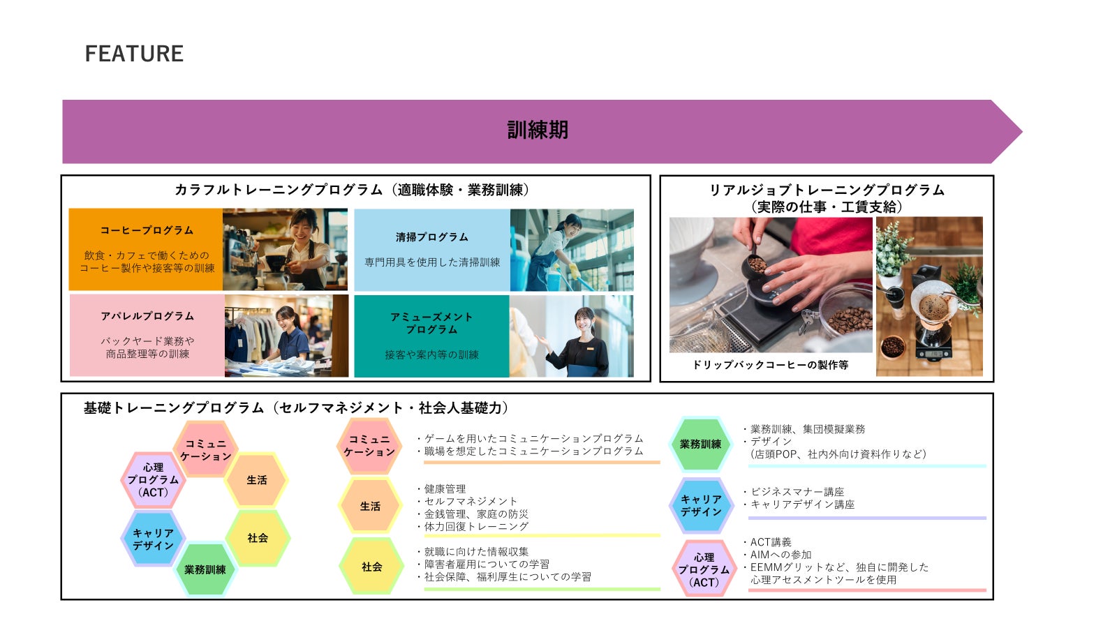カラフルトレーニングプログラムは、アパレルブランドやカフェチェーンとプログラム開発を行っています。そのため、就職後をイメージした、よりリアルな訓練が可能です。多様な選択肢の中から、自分に合った働き方を見つけ、サービス業で活躍する障害者の拡大に寄与します。