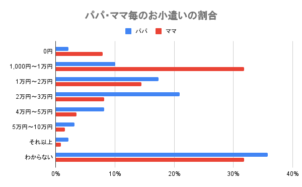 最も多かったママのお小遣い金額は、全体の3割を占めた「1,000円〜1万円(32%)」で、続いて「1万円~2万円(15%)」が全体の1割程度を占めました。一方、パパのお小遣い金額は「2万円~3万円(21%)」が全体の2割を占め、次いで「1万円〜2万円」が2割弱となり、約1割は「1,000円〜1万円(10%)」であることが調査より判明しました。