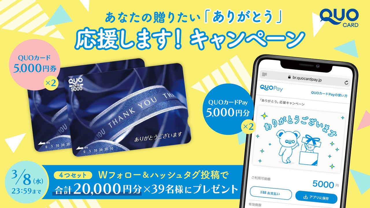 期間中、ハッシュタグ「#QUOカードでありがとうを贈る日」をつけて感謝を伝えたい相手とありがとうの気持ちをツイートすると、QUOカード10,000円分・QUOカードPay10,000円分の合計20,000円分を抽選で39名様にプレゼントします。
