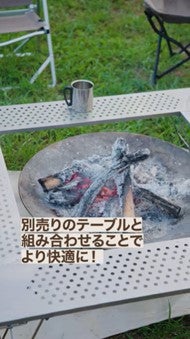 最短3秒で設営可能な簡単すぎる焚火台「ファイアーディスク」と比べ焚火スペースが77%UPし、家族やグループで焚火を囲み楽しめるサイズが登場しました。焚火台の直径は60cmで、大きくフラットな形のため、自由に焚火を組むことが可能です。BBQ用のグリルとしても活用でき、付属の焼き網を使用することで網を動かさずに調理の途中でも炭の継ぎ足しが簡単に行えます。耐荷重約30kgとコールマンから発売しているダッチオーブン3サイズを使用した調理も可能です。さらに、「ファイアーディスク」同様、幅10cmのサイズにコンパクトに収納ができ、付属の収納ケースで持ち運びも簡単です。