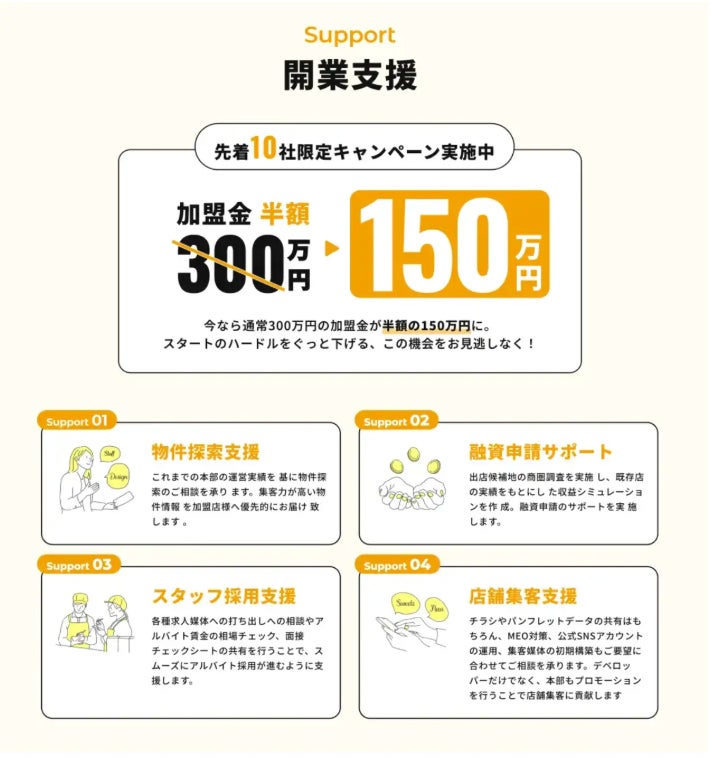 難しいスキルは必要とせず、簡単なオペレーションで店舗運営が可能。飲食未経験の方でも安心して始められる業態です。短期間の研修で運営スタートが可能です。