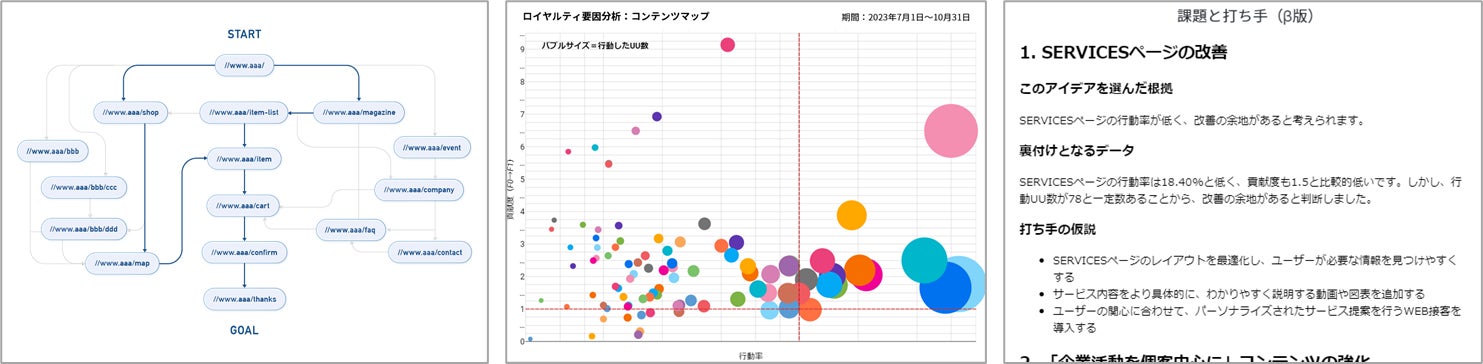 KGIやKPIの達成に繋がるWebサイト内でのユーザーの主要な行動経路を、特別な操作の必要なく可視化します。その行動経路データを元にしたWebサイトの課題と具体的な対策(サイト内導線改善、CVにつながるコンテンツの発見など)が容易に把握・確認が可能です。