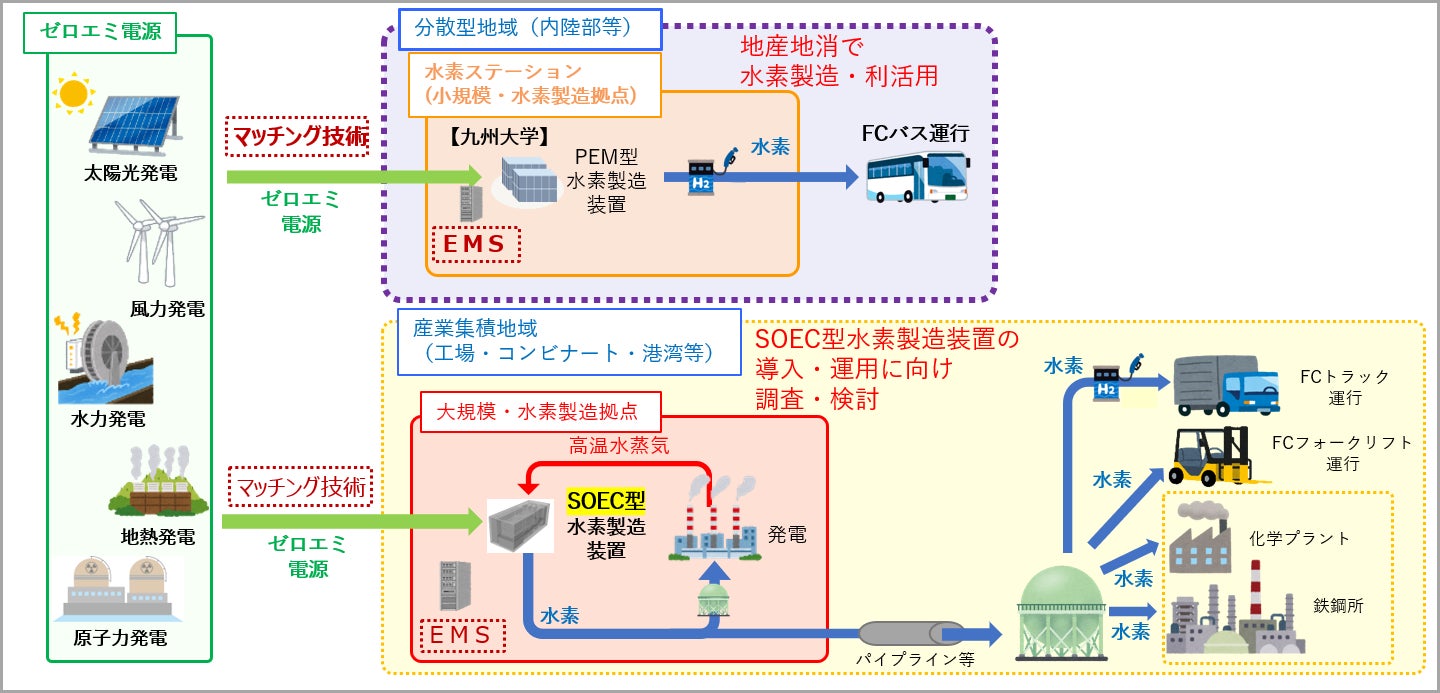 本事業は、内陸部等の分散型地域において、地産地消で水素を製造、利活用する水素社会地域モデルの構築を目的に、九州大学の水素ステーションを活用し、九州の豊富なゼロエミッション電源を活用したカーボンフリー水素の製造に向け、エネルギーマネジメントシステム(EMS)や電気の供給と需要を結びつけるマッチング技術の開発を行うものです。