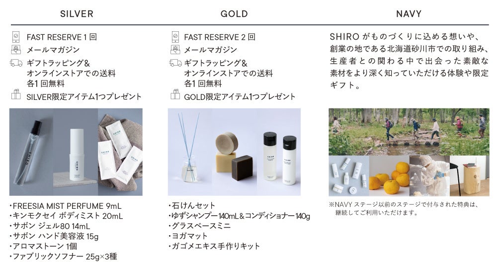 SHIRO 店舗もしくはオンラインストアでのご購入内容に応じて、会員ステージを付与させていただきます。会員ステージごとにSHIRO ならではの特別な特典をお受け取りいただけます。