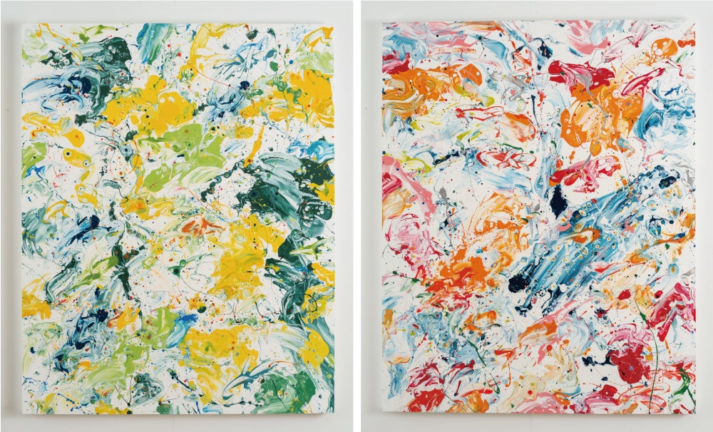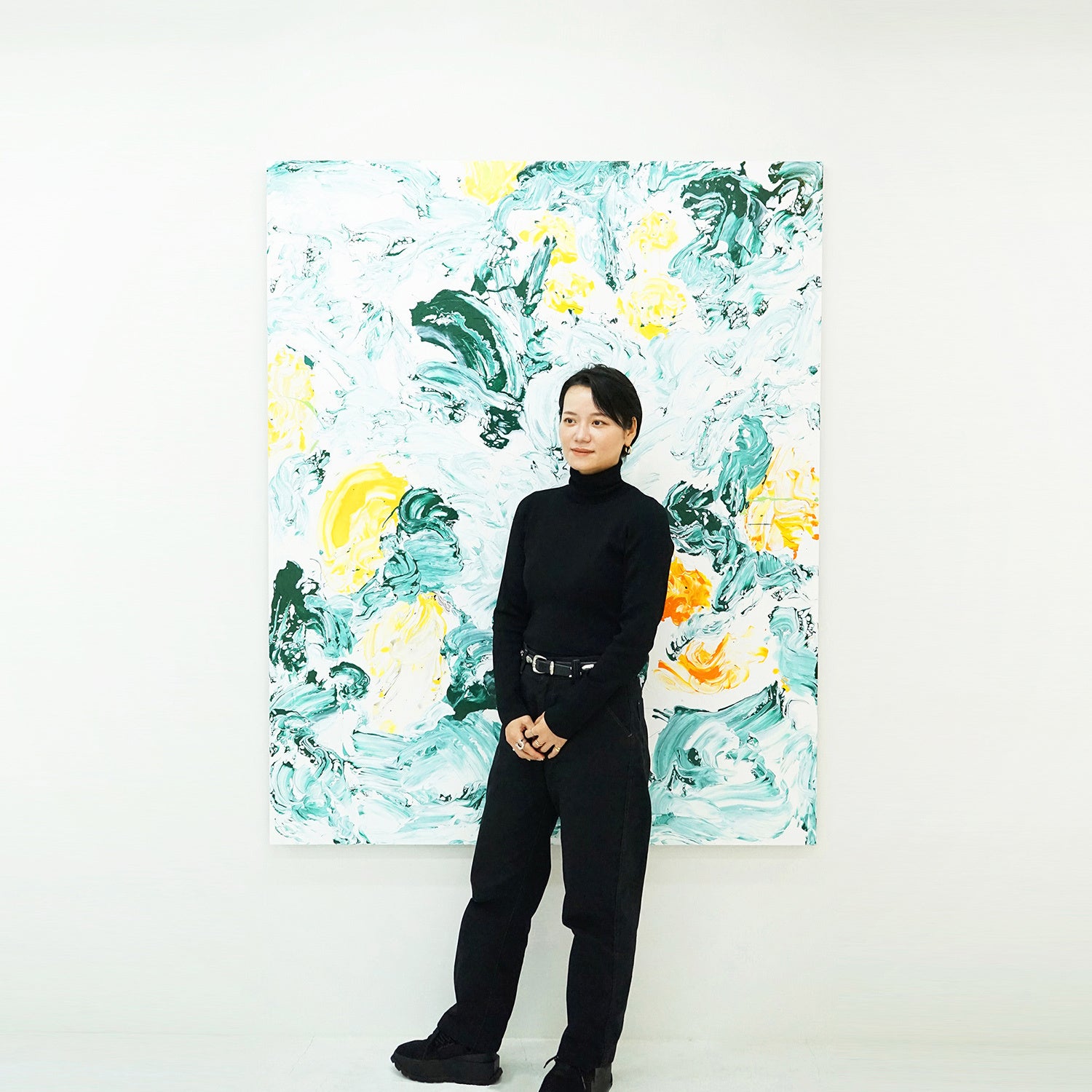 第3弾のコラボレーションアーティストは、木下友梨香さん。花農家で育った生い立ちをもとに、幼少期に見た記憶の中の花や植物を抽象表現した作品を制作しています。ペンキを手に付けてダイナミックに描いていく力強さと、緩急あるタッチの繊細さを兼ね備えたエモーショナルな作風が魅力的なアーティストです。抽象表現主義に影響を受けながら、日々生きていく中で霞んでいく視覚的な記憶の印象を絵に落とし込み、過去から現在を表現しています。